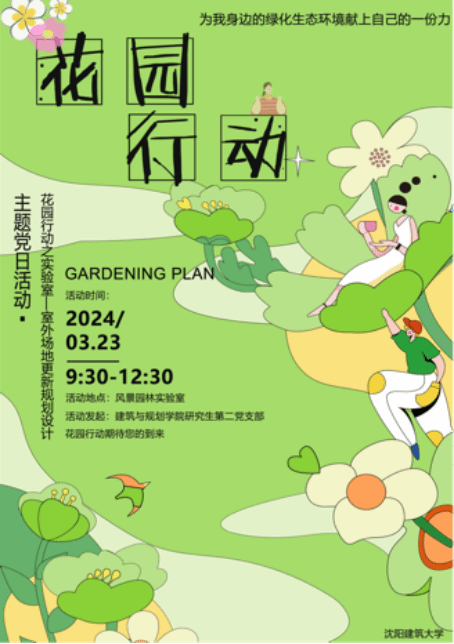 为促进景观规划学科与党建工作全面深入融合,进一步贯彻学习《习近平生态文明思想学习纲要》,williamhill中国研究生第二党支部在党支部书记魏宜老师的带领下开展了“花园行动”第一季度主题党日活动,将“党建花园”的概念引入校园,切实把构建产教融合共同体转化为实际成效,深化党建引领学校育人体系高质量发展,充分发挥党员同志的先锋模范带头作用。