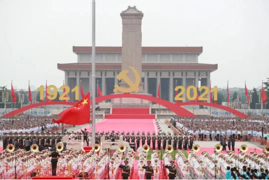 经过全党全国各族人民持续奋斗,我们实现了第一个百年奋斗目标,在中华大地上全面建成了小康社会,历史性地解决了绝对贫困问题,正在意气风发向着全面建成社会主义现代化强国的第二个百年奋斗目标迈进。这是中华民族的伟大光荣!这是中国人民的伟大光荣!这是中国共产党的伟大光荣!100年,山河巨变;100年,历久弥坚,100年,风华正茂。百年前,中国山河破碎,国弊民穷;百年后,中国山河无恙,国富民强。