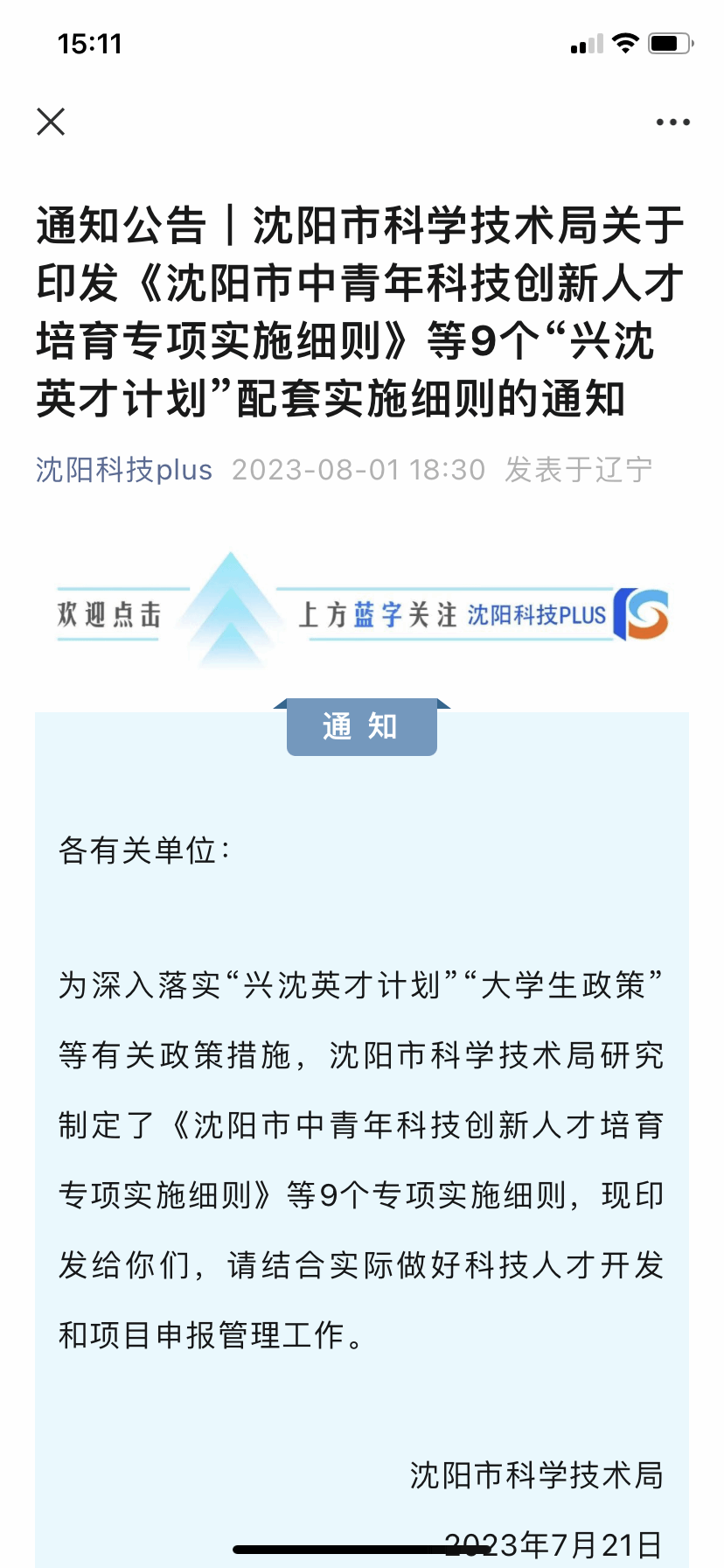 转发科技处通知:将《沈阳市中青年科技创新人才培育专项实施细则》等9个“兴沈英才计划”配套实施细则转发给各位老师,请通知符合条件并有申报意向的老师提前做好准备,具体申报时间等待沈阳市科技局另行通知。谢谢
