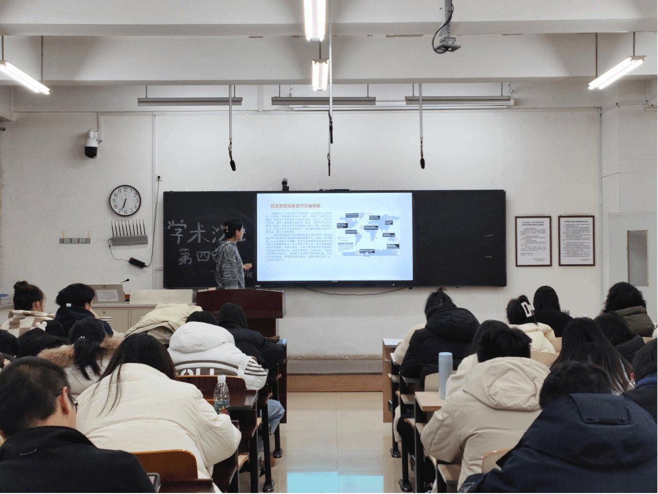主持人介绍完主讲人及其讲解内容后,活动正式拉开序幕。首先开始的是我们活动的第一个主题“寒地微气候影响下的住区空间形态与建筑能耗协同优化研究”。四位主要演讲者依次登台,围绕报告主题进行了深入的讨论。他们对建筑学设计研究策略进行了详尽的分析。首先,王楠同学对我国寒地地区用能现状、气候现状以及相关法律条例背景进行介绍。随后,徐君辉同学、王思琦同学、侯凯怡同学三位同学结合研究方向,分别讲解国内外针对微气候与建筑能耗的研究进展、作用机制及其原理、优化策略等。为学弟学妹们详细讲解了建筑节能设计的研究意义。