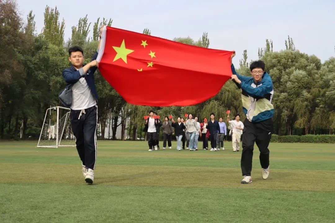 在阳光明媚的操场上,同学们朝气蓬勃,他们举着国旗迎风奔跑。挥洒着青春的力量。同学们集体参与,留下了许多充满创意的国旗合影。照片记录下少年人的笑脸,和他们眼中对对祖国的热爱与自豪。