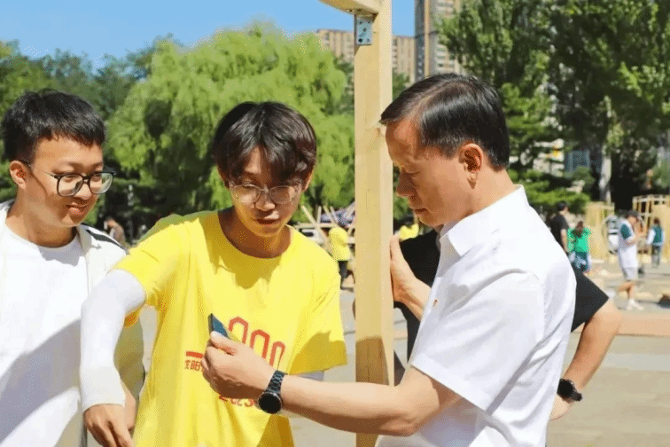 竞赛现场,董玉宽观看了学生搭建过程,与同学们亲切交谈,探讨了建筑设计理念与实施搭建的感受和收获。李宇鹏宣布大赛开幕。徐博以及我校学生代表分别作为师生代表发言。