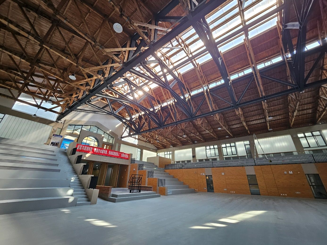 东贸库始建于1950年,是新中国成立初期东北地区重要物资储备库,见证了新中国初期的奋斗历程,承载着城市工业发展的历史记忆。迁建到我校后改造为教学科研实践基地,让老建筑重新焕发了新生。在建筑投入使用前夕,针对建设后遗留下的建筑垃圾和污垢,学院党委组织师生党员对东贸库室内空间进行全面清理和打扫。师生党员们以辛勤的劳动,用双手为这座承载着奋斗精神的历史建筑拂去尘埃,使其焕然一新。