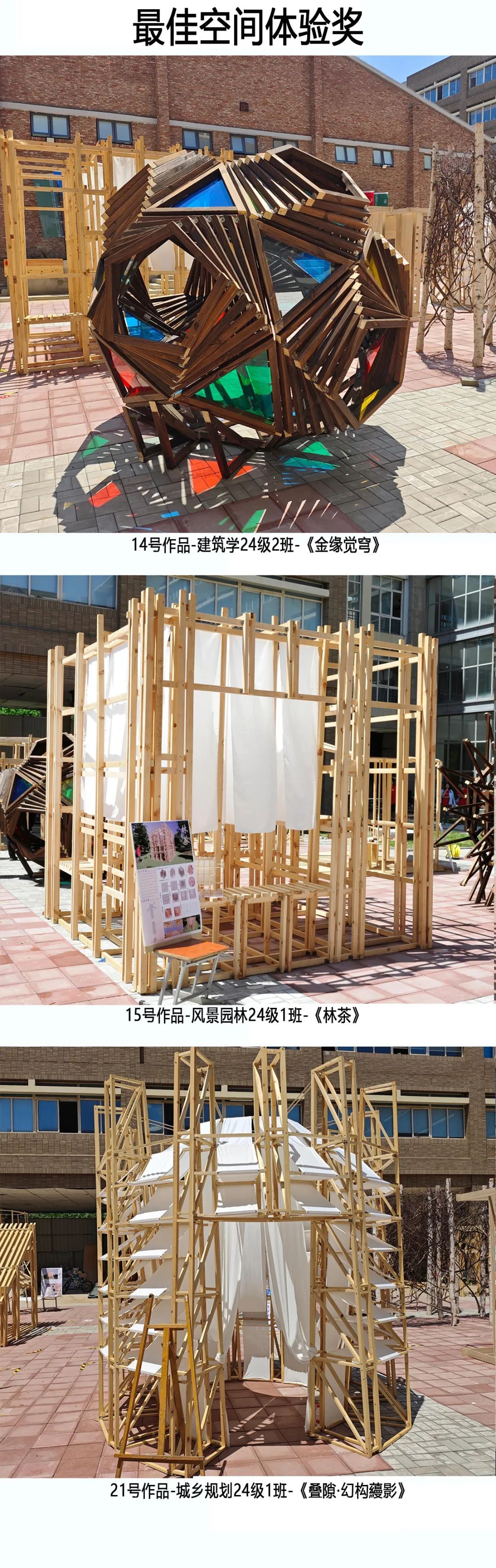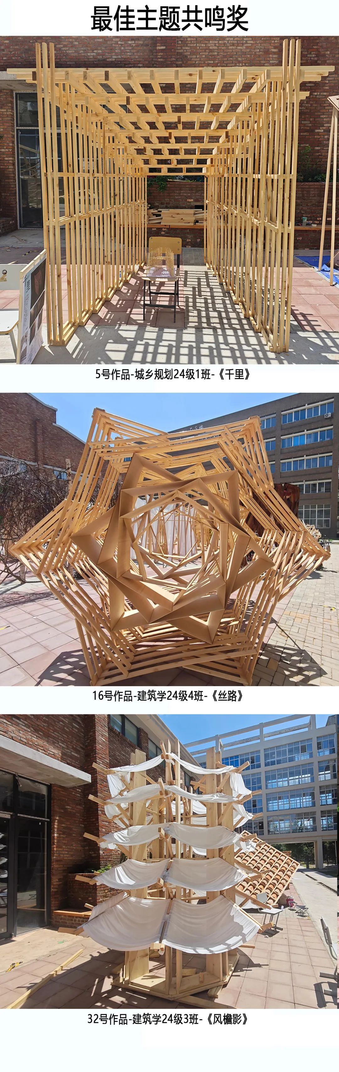 本届“木憩”实体搭建竞赛以“对话”为主题,与历史对话——传承与演绎,与天地对话——冥想与对望,与古刹对话——致敬与创新。由全国工程勘察设计大师张伶伶教授命题。校内搭建节为全国赛事的预选赛,共设立6大类18个奖项,分别为最佳主题共鸣奖、最佳结构设计奖、最佳形态创意奖、最佳材料运用奖、最佳创新技术奖、最佳空间体验奖,诠释“对话”主题的深度与温度,聚焦结构创新性、稳定性与材料效能,突出视觉张力、环境融合及形态叙事,探索可持续性、经济性与表现力的平衡,嘉奖技术应用的原创性与实用性,营造具有情感共鸣的场所精神。