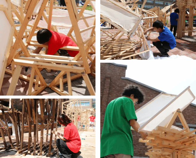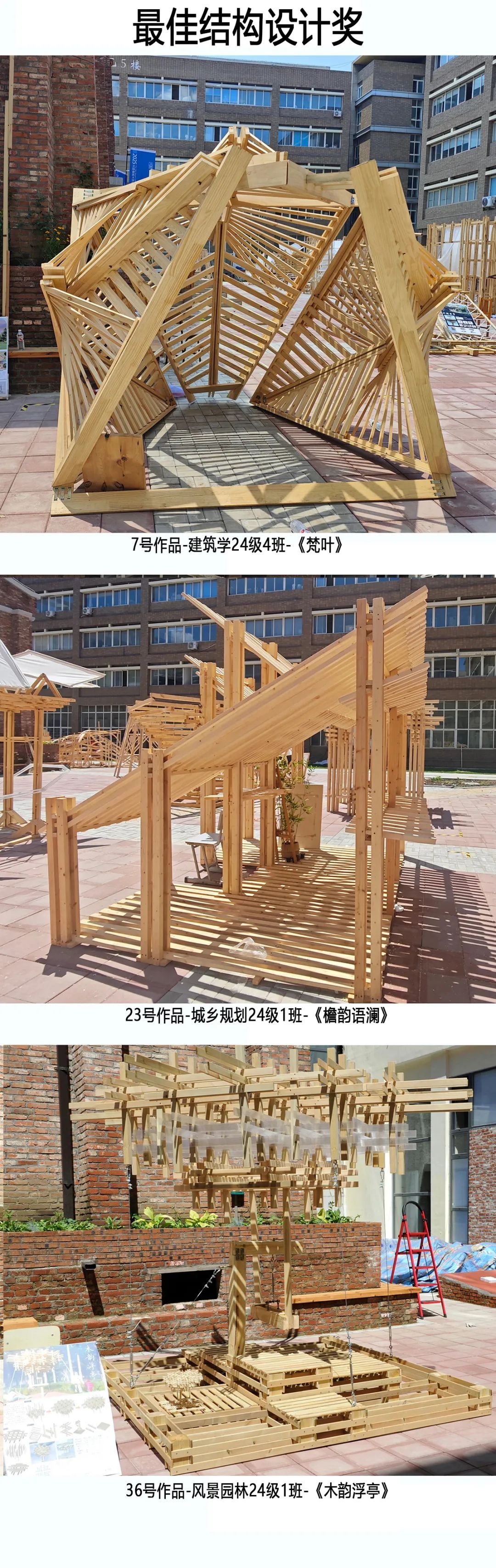 搭建设计竞赛是我院的传统赛事,自2010年创立以来备受关注,不仅为同学们搭建了实践平台,通过亲身建造深入理解材料特性,精研建造技艺,而且锤炼了动手能力和团队协作精神,深化建筑认知,并实现创新理念的转化。2017年,学院成功主办首届辽宁省大学生实体搭建设计竞赛。2024年,活动荣膺中国建筑学会科普专项支持。今年,竞赛升级为首届全国大学生“木憩”搭建设计竞赛,来自全国11个省市21所高校的116件作品参加了比赛。
