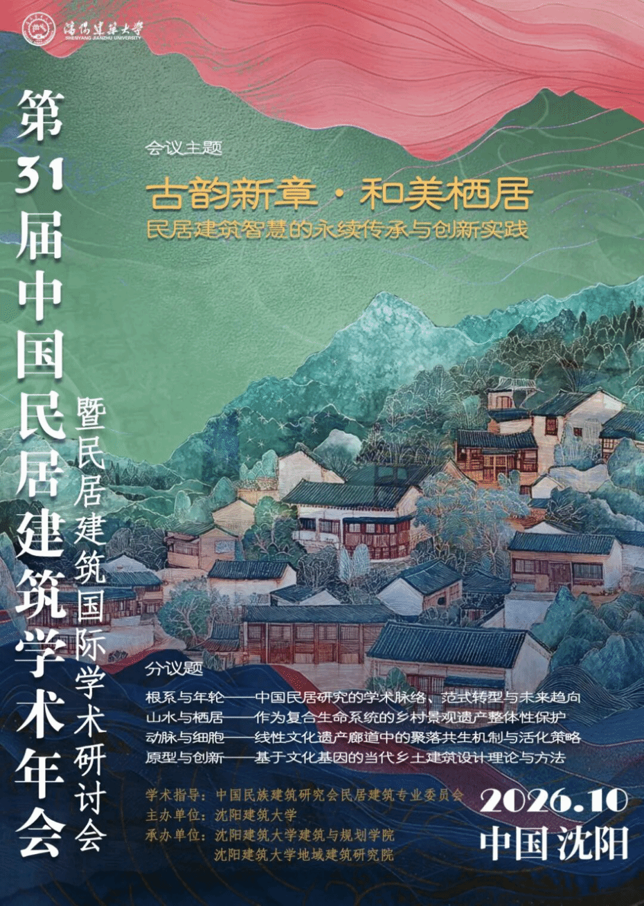 本次会议聚焦四个分议题:第一,进行学术史的深度梳理与范式反思。 系统回顾中国民居研究从营造学社至今的学术流变,重点探讨在不同时代社会文化思潮影响下,研究视角如何从“形式风格”转向“文化生态”,再向“社会技术系统”演进。思考在数字人文、气候科学等交叉学科影响下,民居研究的理论框架、方法论与价值评价体系如何重构,并展望其在回应碳中和、数字乡村等国家战略中的新角色;第二,拓展遗产边界,强调人、居、境的有机统一。依据并深化景观遗产观,将民居视为由农业系统、水系网络、生物栖息地、信仰空间及聚落肌理共同构成的“山水栖居”生命综合体。探讨如何通过国土空间规划、生态修复与文化保护的多重工具,实现从单体民居保护到全域、全要素文化景观系统维护的跃升,为乡村振兴提供基于地域生态文化本底的可持续发展模型;第三,聚焦宏观遗产结构与微观社区生活的互动。 深入研究长城、大运河、长江国家文化公园等国家线性文化遗产廊道中,作为关键“细胞”的城镇、村落、驿站如何与遗产“动脉”互动共生。探讨这些聚落在历史上的人地关系适应智慧,以及在当代面临的挑战,提出基于廊道整体价值的聚落功能复兴、空间整合与社区发展策略,避免保护与发展的割裂;第四,指向设计创新,寻求文化传承的当代表达。超越形式模仿,深入解析传统民居的“空间原型”“构造原型”与“精神原型”。探索如何将这些文化基因,通过现代设计语言、材料与功能需求进行创造性转化,形成兼具地域识别性、现代生活品质与环境响应性的新乡土建筑理论、评价方法与设计实践,回应当代人对“诗意栖居”的向往。