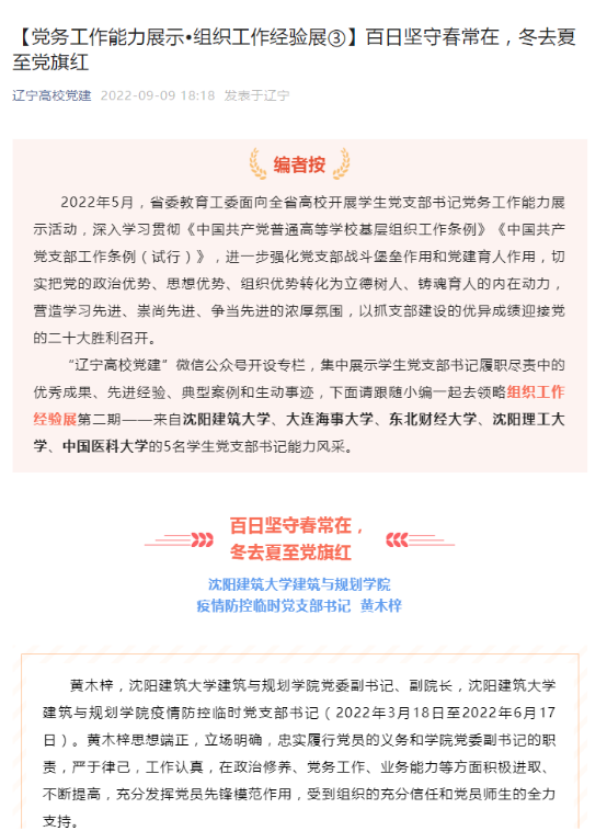 ——“辽宁高校党建”微信公众号报道学院党委副书记黄木梓先进事迹