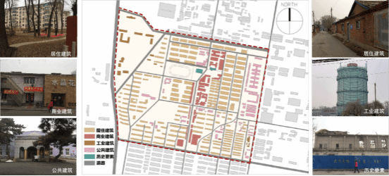 ②总平面图:标注历史建筑、新建/改造区域、公共空间系统;